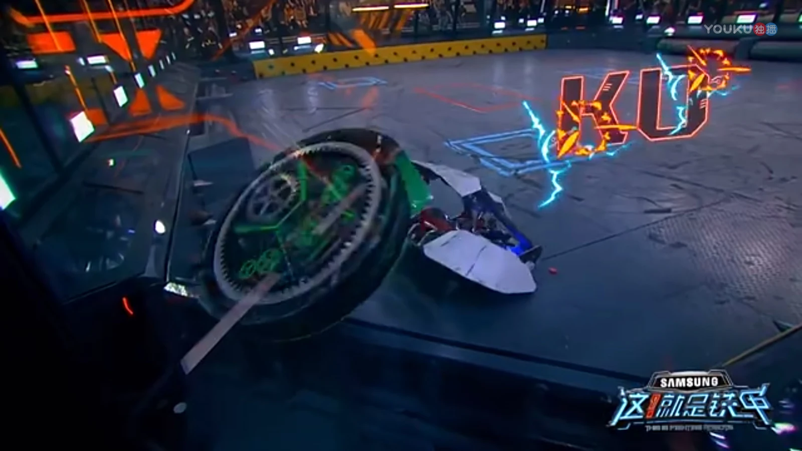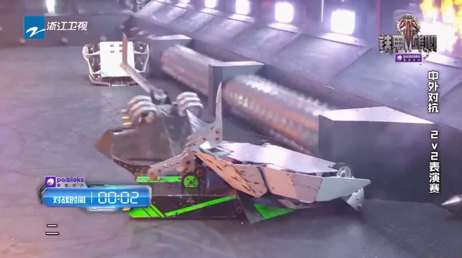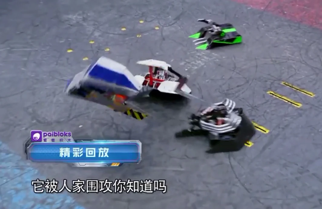 Tánshè then caught Saber from behind and threw it over, where it slid towards the wall. Greedy Snake charged in to assist it, but Tánshè and Vulcan both trapped the Chinese team there. Vulcan landed two axe blows on the chassis of Saber, while Greedy Snake once again grabbed Tánshè, prompting Vulcan to pound the top of Greedy Snake, including its weapon system, throwing sparks. Greedy Snake was able to pick up Tánshè and turn it over, but Vulcan prevented Saber's self-righting by trapping it under the spikes on the arena wall. Vulcan pinned Greedy Snake against the arena wall, but while Saber struggled its way out of its current position, Tánshè launched it into the corner of the arena.